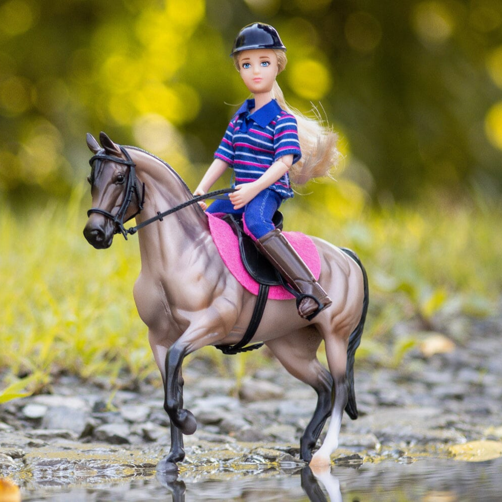 This lovely English rider is casually dressed for a lesson on her beautiful bay roan horse! Includes: 6" articulated rider, horse, saddle cloth, English saddle and bridle. Compatible with any 1:12 scale model or accessory from the Breyer Classics series.