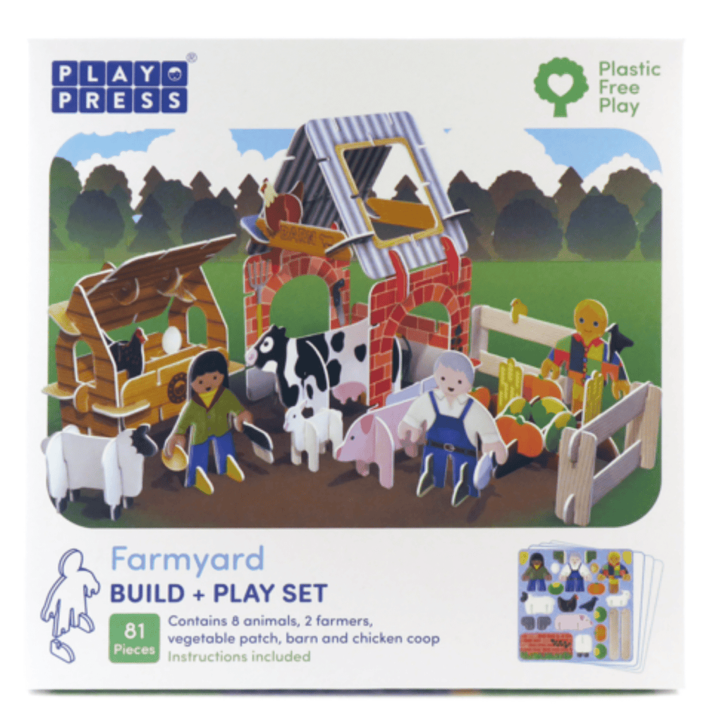 The set contains 81 pieces to build and play with. These include a barn, chicken coop with moving roof, 8 animals, 2 farmers and a complete vegetable patch. Add eggs into the coop with your chicken or move animals into the barn.