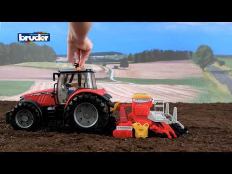 This Pottinger harrow-mounted seed drill is a combined rotary harrow and seed drill, so it tills the soil and plants the seed at the same time. The seed tank can be opened, filled and drained. The stairs fold down to allow a Bruder man (not included but available separately) to climb up, the circular spike harrows and seed unit can be folded up, just like the real thing, in order to drive along the road. Compatible with all Profi-Serie tractors.
