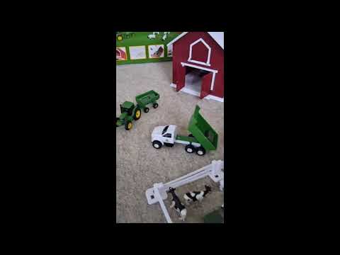 This 24 piece playset comes complete with a barn, truck, tractor, trailer, four cows, four sheep, six hay bales and six fence pieces. All the pieces fit into the take along barn, simply lift the roof for storage and carry along with the built in handle.