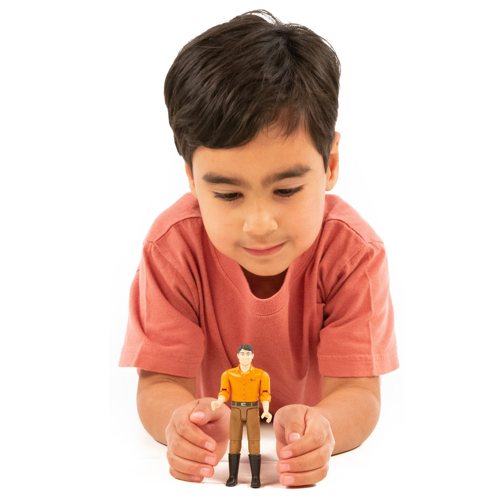 Bruder bWorld figure with 3-dimensional moveable limbs and head and hands that can grasp objects or hold onto vehicles. Perfect accessory for Pro Series tractors, vehicles and agricultural implements. Use the figure to drive a tractor, ride a horse, steer a fork lift, or milk a cow and make your play farm come to life! This man is wearing an orange shirt and brown jeans, with wellies on his feet.