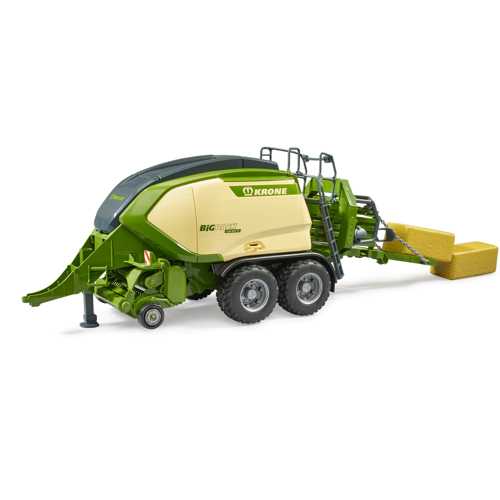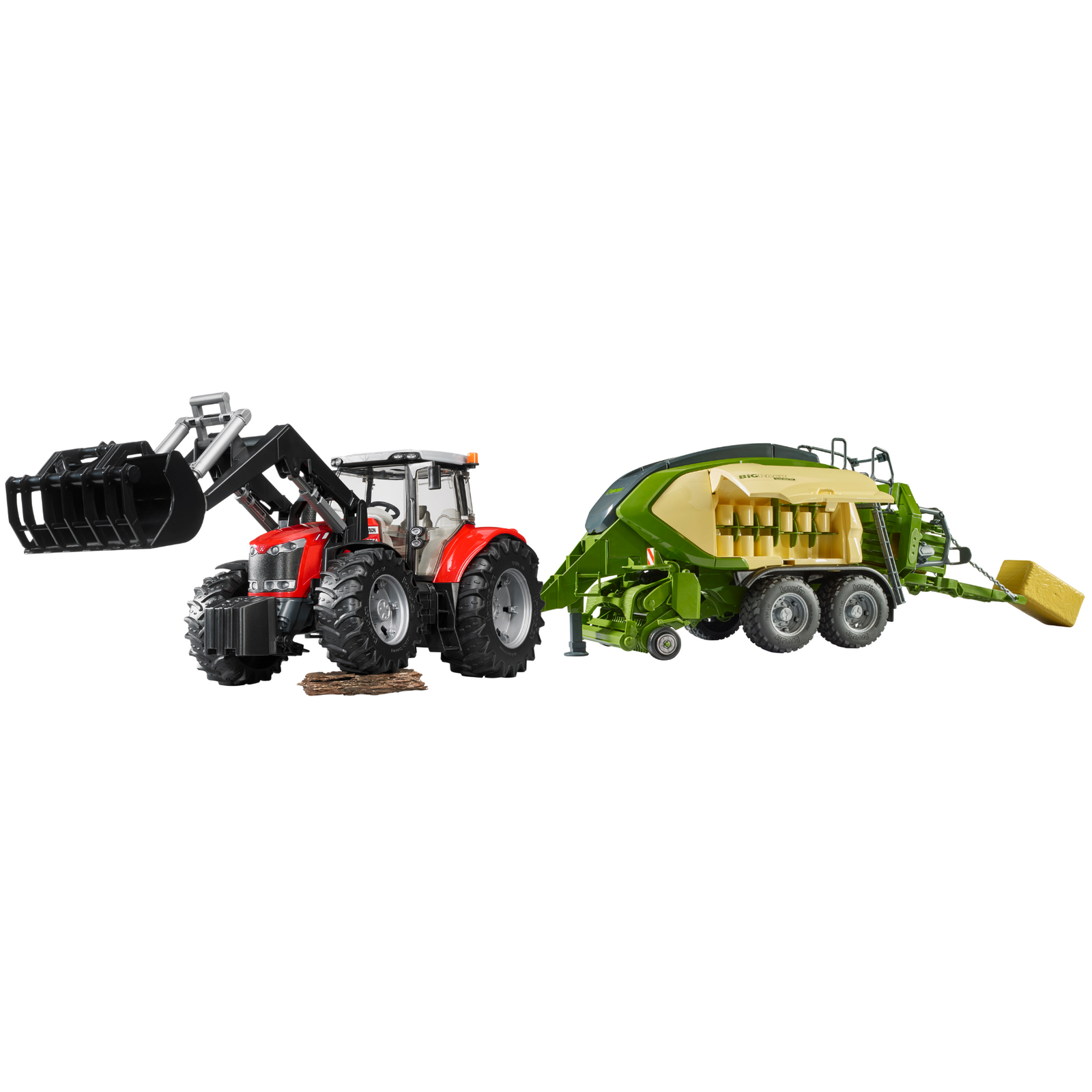 This Massey Ferguson 7624 tractor comes with a Big Baler. The tractor has a detachable frontloader, a glazed cab, an opening bonnet, an off-road full floating axle, which improves agility, a detachable front weight. The Krone BiG Pack Large Square Baler authentic decal details, opening side and top flaps, and a working pickup and discharge, it brings realistic baling action to playtime. The adjustable stabiliser foot provides stability, while the rolling wheels with tyre tread detail ensure smooth movement. Includes two large square bales. Compatibale with all Profi-Series by Bruder accessories.
