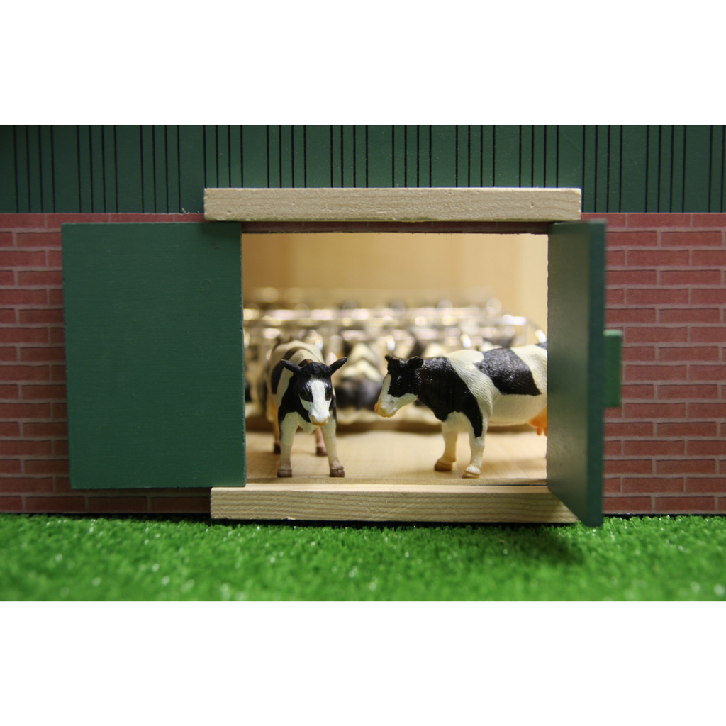 This fabulous wooden farm comes with a large barn, ideal for your cows and other animals, with a metal feeding barrier. There is a big shed for your tractors and other implements with a hay loft above. The roof is hinged so it can flip back for easy access to the barns. We have added a John Deere Tractor with Frontloader, a Fodder Mixing Wagon with some feed to put inside it, 12 cows and some square bales.