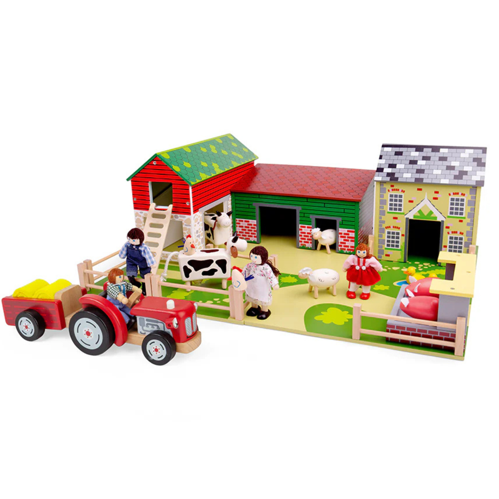 The farm comprises of barn with loft and ladder, animal shed, farmhouse, pigsty, fences and wooden play base. The roof panels attach with magnets making them easy for small hands to access, and enabling children to create their own farm scenes easily. Playing with the farm and animals will help children to understand the environment, learn about farm animals, where they live, and how to look after them.